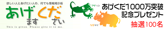 そこで「あげくだ」1000万アクセス(実際のヒット数などはほぼ2000万に近づいています)を記念して、利用会員への感謝を込めて、プレゼント提供とアンケート募集を行います。