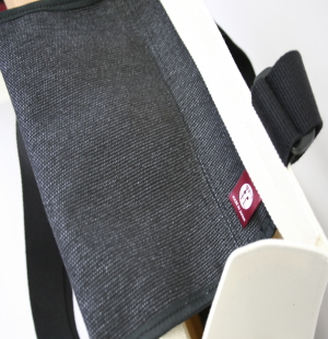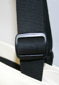 ベルトにはベルト用に織られたテープを使用し、滑り止めの加工などは一切行っておりません。型くずれしにくく、しかし肌に優しい弱起毛ベルトを使用しました。色は黒。汚れが目立ちにくい色と、バッグ素材の生成にマッチングする色を選択しました。