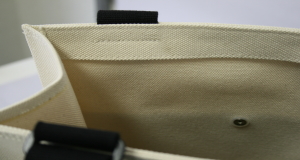 例えば縫製。これだけ厚いキャンバス地となると、普通のミシン針では、対応できなくなる場面も出てきます。キャンバス地を重ねて縫う個所で、一番厚いところは8枚重ねで、厚みは5mmほどあります。しかも布地ですから織り糸の流れがあり、織り糸の隙間に針が入れば良いのですが、糸に針があたると針が通りにくく、普段の高級革鞄を縫製する以上の時間がかかったと苦笑しておられました。細かなところにも高級バッグと同様の技術と手間が活かされています。
