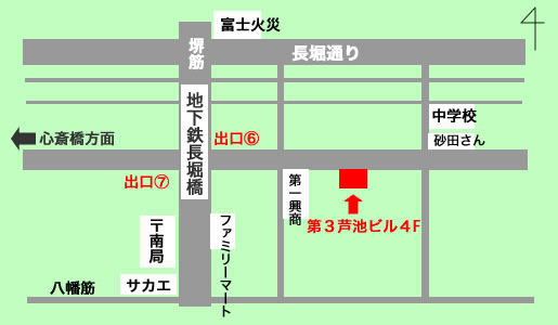 ■地下鉄で2 地下鉄御堂筋線「心斎橋」駅下車。地上にあがり、大丸とそごうの間の道路を東方面へ徒歩15分ほど。右手に長堀橋駅出口7番が見えるので、そのまま大通りを渡り、直進。心斎橋からでも15分程度で、到着します。